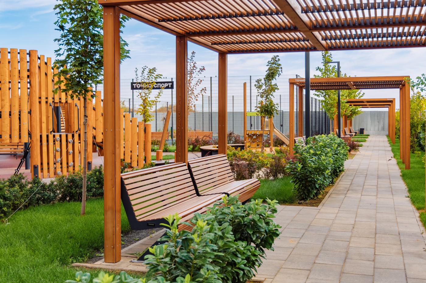 Предусмотрены места для отдыха с шезлонгами и удобными скамейками, установлены арт-объекты и площадка для выгула и дрессировки собак.